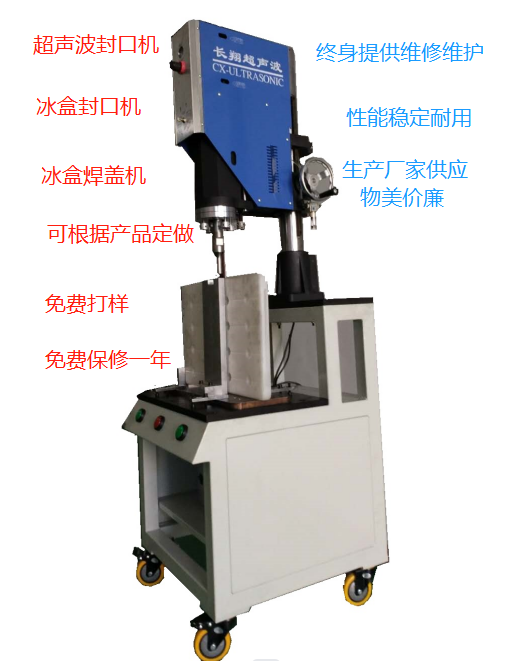 塑料桶盖瓶盖超声波焊接机:又称机油桶盖超声波焊接机,也属于长翔一款经济款超声波焊接设备,本机功率:1500W,频率:20KHZ,输入电压:220V,输出时间:0.01-9.99S,焊接面积:190mm,使用压缩机:1HP,气压范围:1-8bar,振荡系统:线路,电流指示:输出振幅指示,外形尺寸:550*450*1100mm,电箱尺寸:510*490*200mm,净重:100kg。